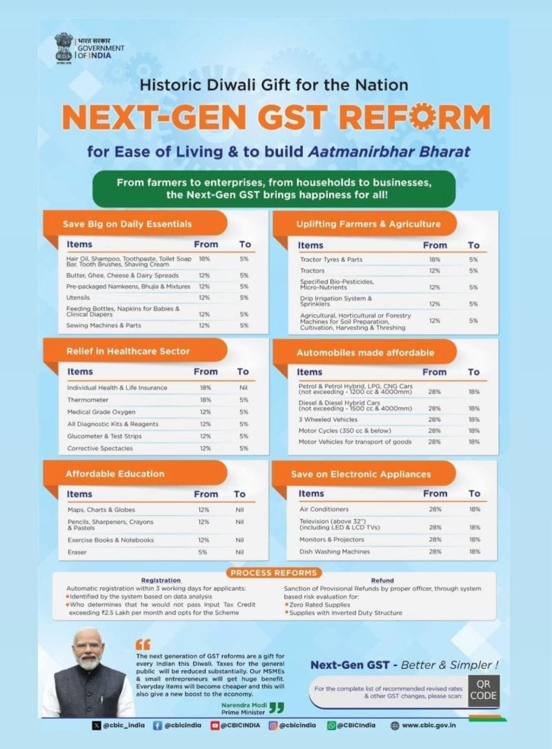 - 18% GST (down from 28%) on big household items like TVs, ACs, refrigerators, and washing machines.