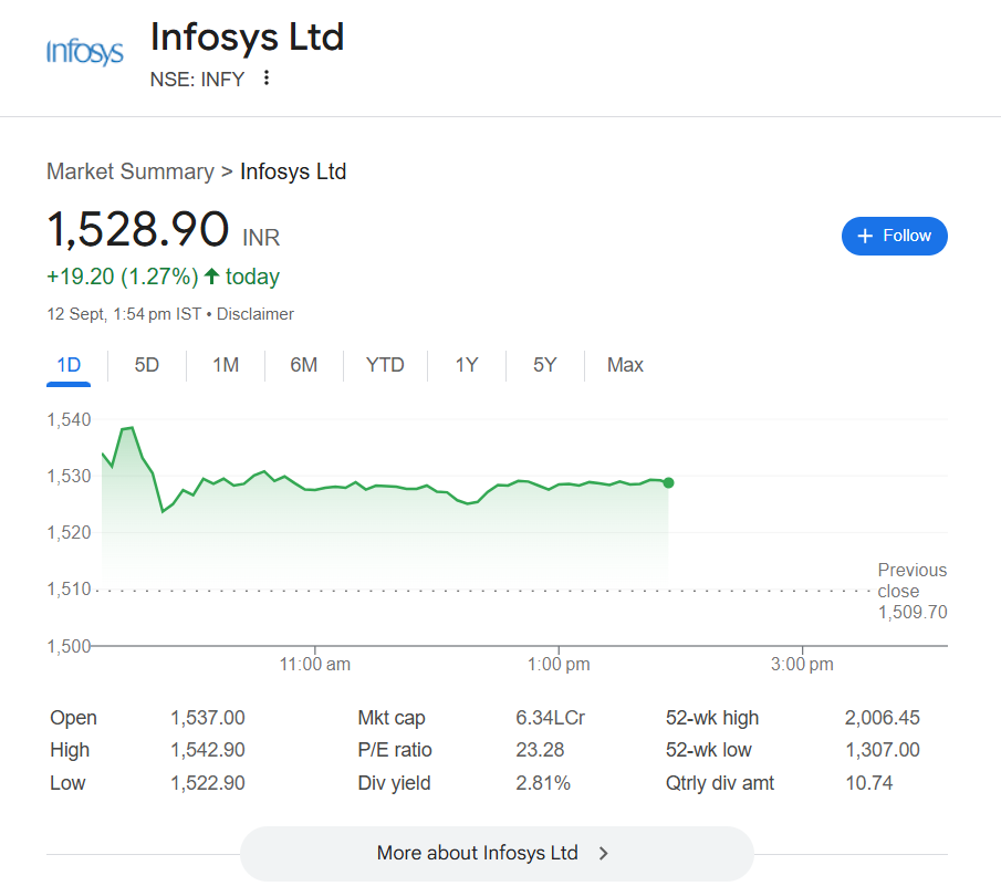 - Now, Infosys is officially offering ₹1,800 per share, which is 19% more than the market price (closing price) on September 11, 2019.